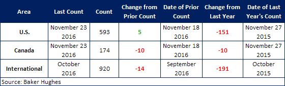 According to Baker Hughes data from November 23, 2016, the U.S rig count for the week was 593 rigs exploring for or developing oil or natural gas. This is up 5 rigs compared to last week, with oil rigs up 3 to 474 rigs, gas rigs up 2 to 118 rigs, and miscellaneous rigs unchanged at 1 rig. Compared to this time last year, the 593 count is down 151 rigs, with oil rigs down 81, gas rigs down 71, and miscellaneous rigs up 1.