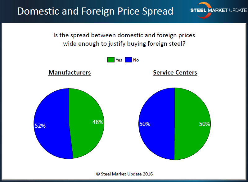Right now our respondents are split as to the competitiveness of foreign steel pricing compared to domestic steel. We asked both groups, is the spread between foreign and domestic steel prices wide enough to justify buying foreign steel? The results are below: