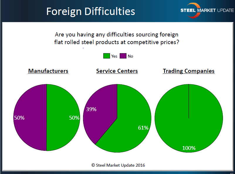 Besides pricing we found that availability is also an issue in sourcing foreign steel. We asked the manufacturing companies, service centers and the trading companies if they were having any difficulties in sourcing foreign steel at competitive prices. We thought you might find the results interesting: