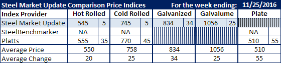 Steel Market Update (SMU) was more measured based on the results of our mid-November market trends survey which was completed just before the Thanksgiving Holiday in the United States. The SMU hot rolled number was up $5 per ton to $545 per ton, cold rolled was also up $5 per ton to $745 per ton.