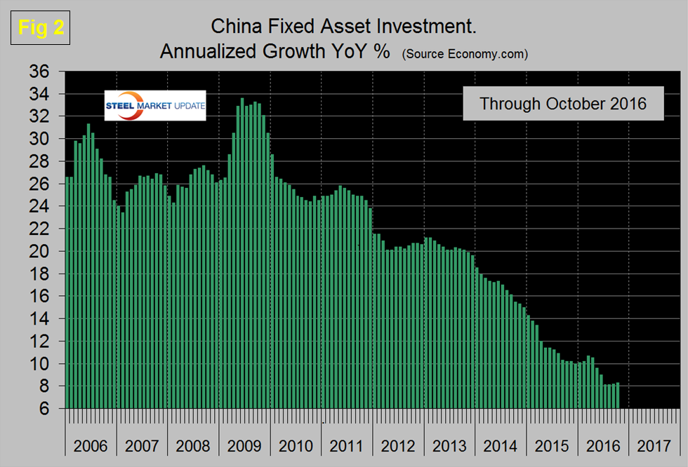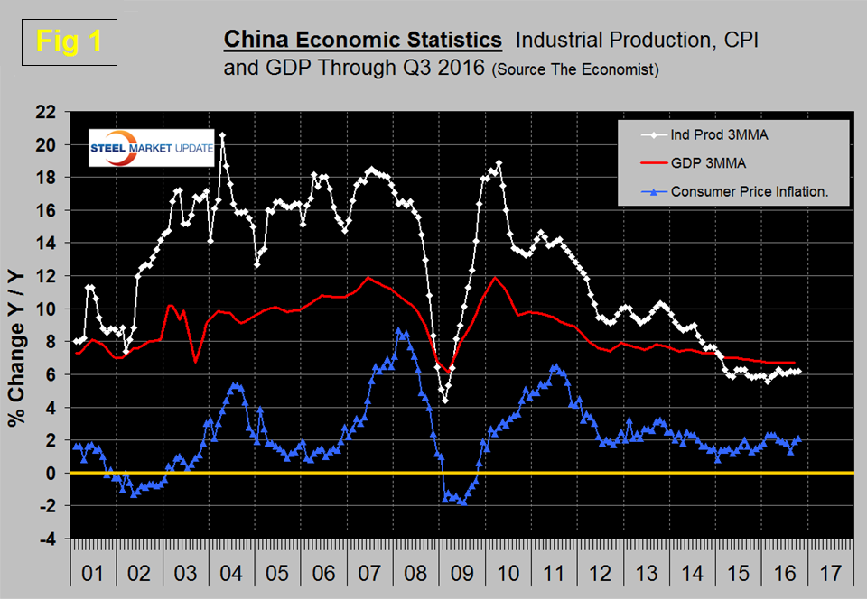 Once each quarter we publish the official statistics for Chinese GDP, industrial production, consumer price inflation and fixed asset investment. Currently available GDP data is through the third quarter, other data included here is through October. Many analysts don’t believe these Party self-serving figures but we include them in our reports because of the importance of China in the global steel scene and these numbers are all there is. Figure 1 shows published data for the growth of GDP, industrial production and consumer prices through the third quarter of 2016.