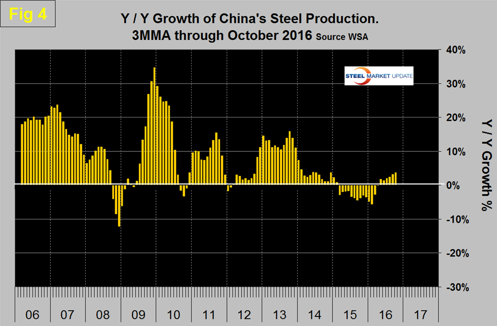 China’s production after slowing for 13 straight months on a 3MMA basis year over year returned to positive and accelerating growth each month in the May through October time frame and accounted for 50.3 percent of global production in October. The slowdown in Chinese steel production that the rest of the world has demanded is NOT happening. Another way of looking at the change in growth is shown in Figure 4.