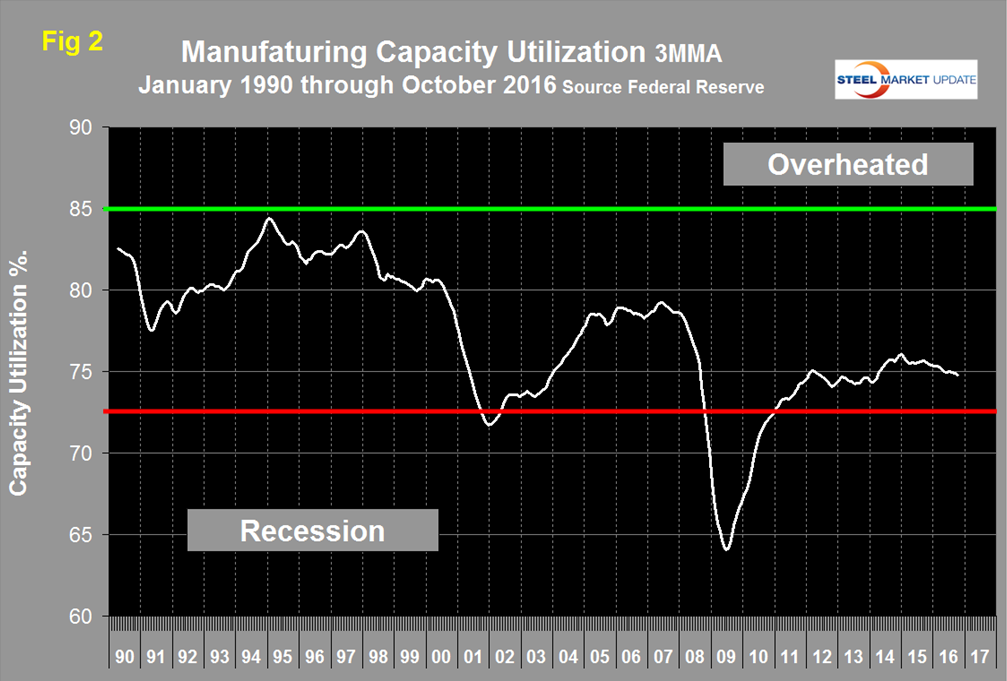 Manufacturing capacity utilization was 74.9 percent in October with a 3MMA of 74.8 percent (Figure 2). In January last year, utilization exceeded 76 percent for the first time since the recession and has been slowly declining ever since.
