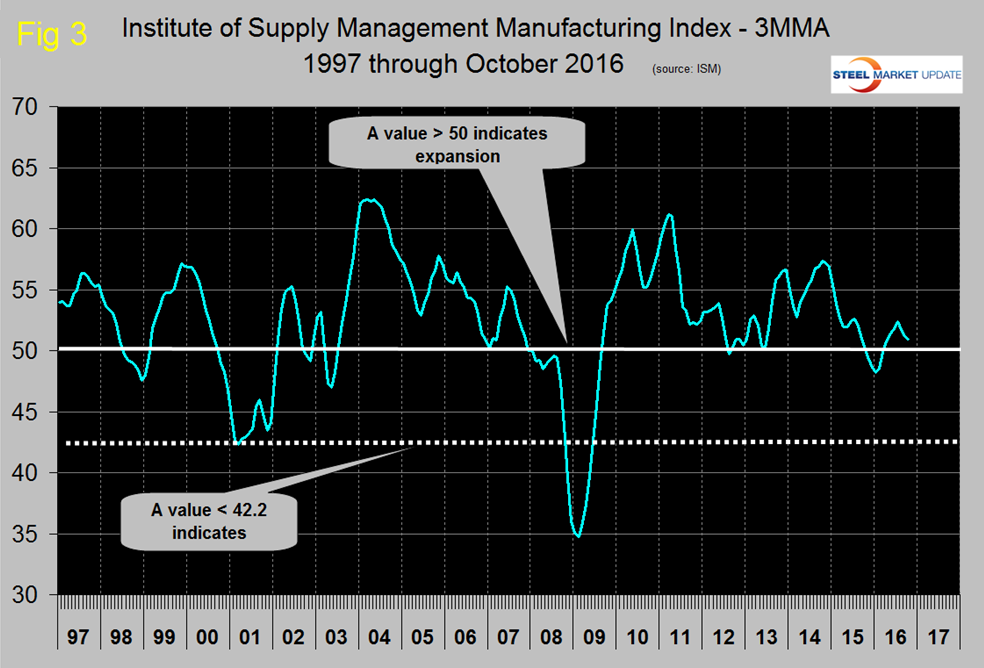 SMU Comment: In March this year the ISM manufacturing index signaled positive growth by exceeding 50 for the first time since October 2015 and had five positive months through July. It dipped below the 50 mark in August and had a value > 50 in September and October when it reached 51.9 with a 3MMA of 50.9 (Figure 3). We regard the ISM index as “leading” therefore combined with positive momentum in the IP index our expectations for manufacturing in the short term are positive. At SMU we try to examine two or three measures of the same activity as a reality check and on this basis manufacturing is flashing green.
