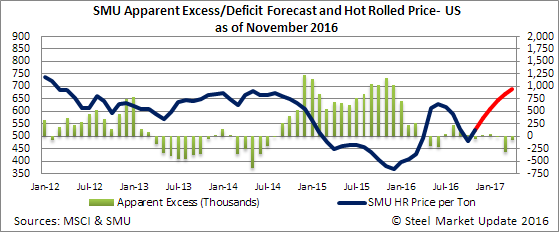 With the recent price increase announcements (4 since October 21) we believe distributors will not try to build inventories at these price levels. This will help keep inventories either balanced or moving into a deficit and that is what we are showing in our new forecast for November through April 2017.