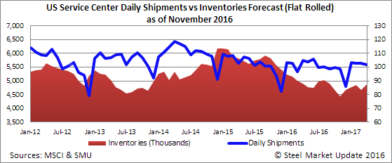 Our forecast was for the U.S. distributors to have a 208,000 ton inventory excess (flat rolled) at the end of October. Based on our model with the 50,000 tons of higher shipments coupled with lower inventories the actual excess was 10,000 tons. Essentially, the service centers are back into a balanced scenario.