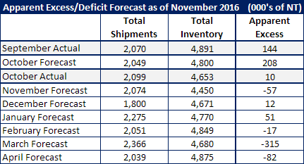 Inventories at the end of November are expected to be 4,450,400 tons which would represent a -57,000 deficit. As you can see by the table provided, with the exception of March 2017 we expect inventories to be in the balanced range during this whole time period.