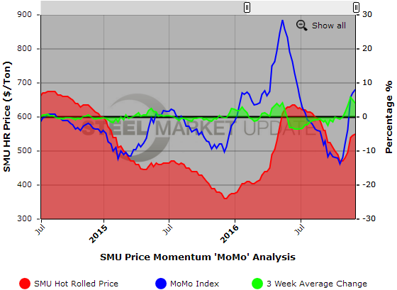 The change in MoMo can be a useful indicator in depicting the severity of price movements and evaluating the directional trend for flat rolled steel prices. The week-over-week change in MoMo was +1.16 percent, following a change of +1.24 percent last week. This indicates that there is a steady upwards movement in hot rolled price momentum.