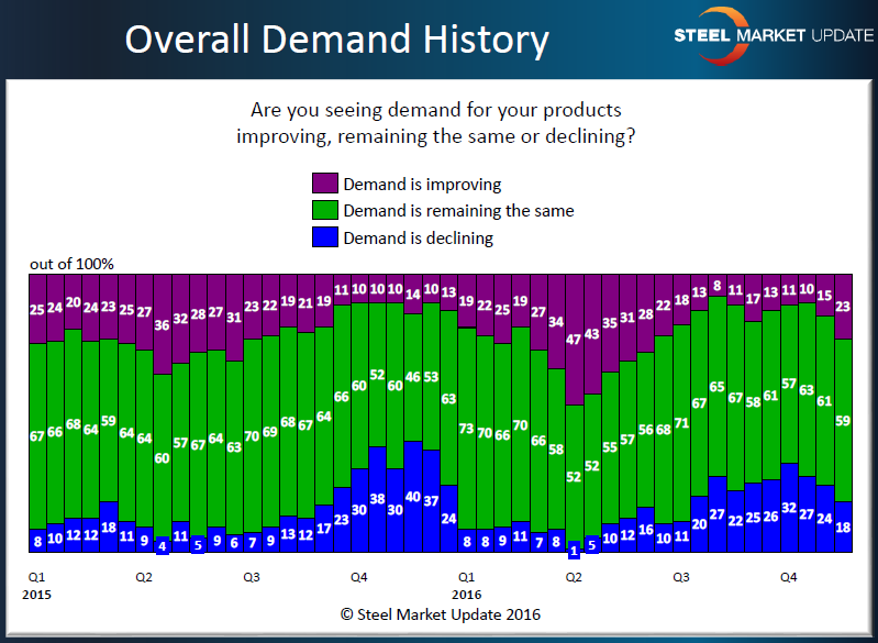 One of the key items we track is demand which we look at in a couple of different ways. First, we want to know if demand for all of our respondents products is improving, declining or remaining the same? In our most recent survey 59 percent of our respondents reported demand as remaining the same while 23 percent reported demand as improving and 18 percent said it was declining.
