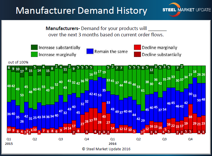 We also break out specific inquiries regarding demand by group. The manufacturing segment is asked two questions: one about generic demand: Demand for your products will (increase substantially, increase marginally, remain the same, decline marginally or decline substantially) over the next 3 months based on current order flows.