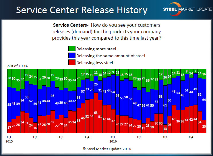 We also ask the service centers about their customers’ release history as a way of gauging demand from their customers. We did see a bump in the numbers this past week as only 20 percent of the distributors reported their customers as releasing less steel than year ago levels. As you can see by the graphic below, this is half what was being reported one month ago. It is also one third of what we saw at this point in time last year.