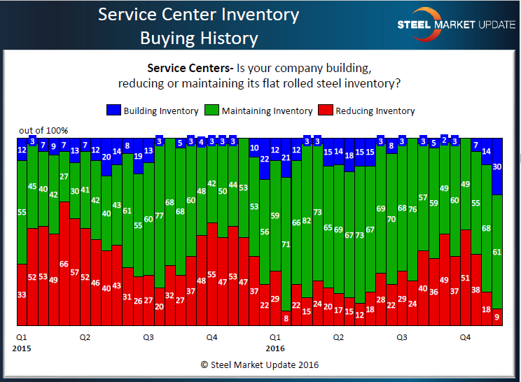In the graphic below you can clearly see the service centers have been reacting to the higher prices by building some inventory back into their systems. The first price increase was announced about the same time we reported 38 percent of the distributors as reducing inventories of flat rolled. Since then that number has dropped to 9 percent with 30 percent reporting they are trying to build inventories.