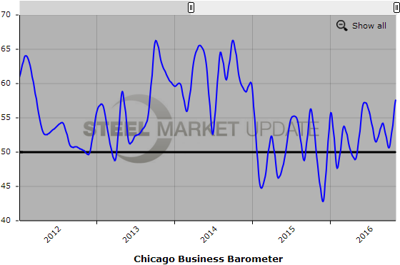 Below is a graph showing the history of the Chicago Business Barometer. You will need to view the graph on our website to use its interactive features, you can do so by clicking here. If you need assistance logging into or navigating the website, please contact our office at 800-432-3475 or info@SteelMarketUpdate.com.