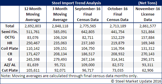 October foreign steel imports totaled 2,713,189 net tons, slightly below September’s total. November license data continues to suggest a 2.8 million net ton month. Here is what the totals by product look like as of December 6, 2016: