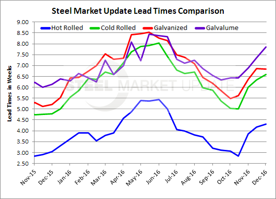 Cold rolled lead times, which averaged less than five weeks (4.78 weeks) one year ago are now averaging six and a half weeks (6.58 weeks) up from 6.35 weeks in mid-November and much improved over the five (5.0) weeks reported in the middle of October 2016.