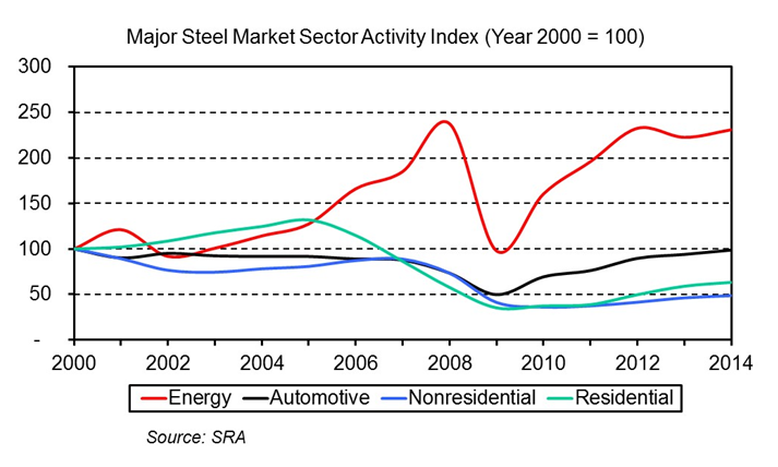 The chart requires a little explanation. All sector activity was converted to an index to display on one graph. Energy equals domestic energy tubular consumption (tons), automotive equals NAFTA production levels, non-residential equals square feet of construction, and residential equals new housing starts.