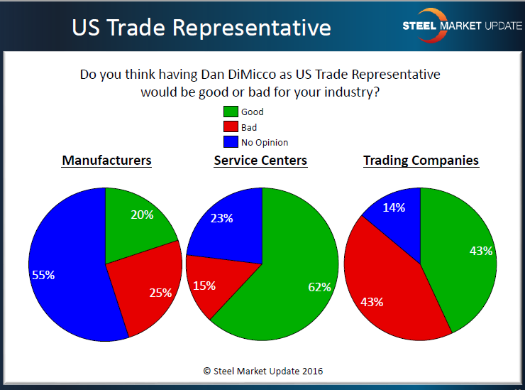 One of the questions asked of each of the major market segments (manufacturing, service centers/wholesalers and trading companies) was about what they thought about Dan DiMicco’s involvement with the Trump Administration as potentially the U.S. Trade Representative. I thought the results were quite interesting.
