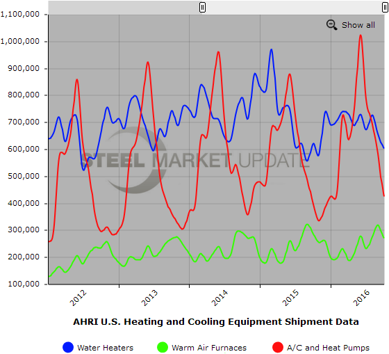 Below is a graph showing the history of water heater, warm air furnace, and air conditioner shipments. You will need to view the graph on our website to use it’s interactive features, you can do so by clicking here. If you need assistance with either logging in or navigating the website, please contact our office at 800-432-3475 or info@SteelMarketUpdate.com.