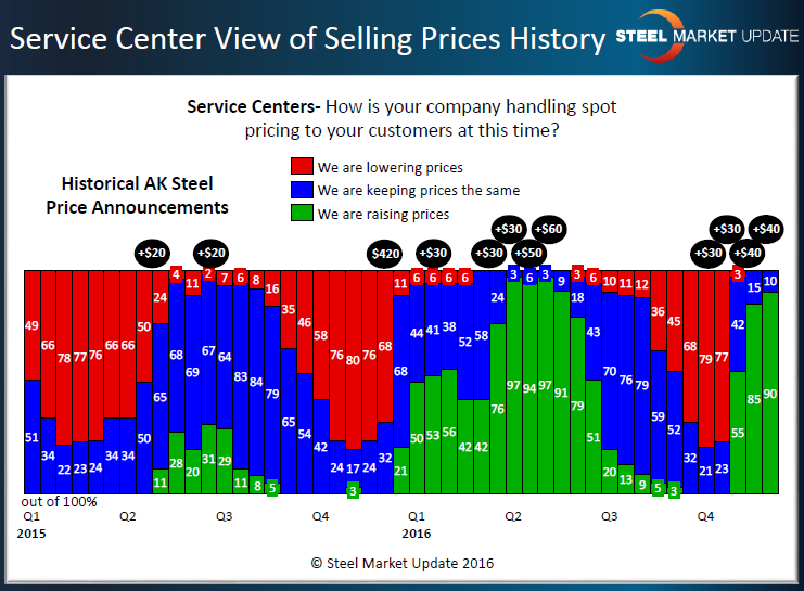 The flat rolled steel service centers are increasing their spot steel prices to their customers. According to our most recent flat rolled steel market trends survey, 90 percent of the distributors responding reported their company as raising spot prices to their end users or to other steel service centers. The 90 percent number is 5 percentage points higher than what we reported two weeks ago and 35 percentage points higher than what we reported at the beginning of November 2016.