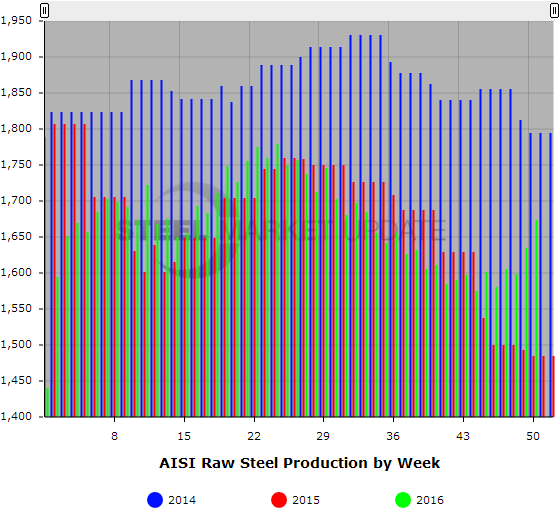 SMU Note: Below is a graphic showing the weekly raw steel production history. To use the graphs interactive capabilities, you must view it on our website. You can do this by clicking here. If you need help navigating the website or need to know your login information, contact us at info@SteelMarketUpdate.com or by calling 800-432-3475.