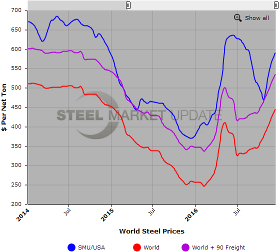 The SteelBenchmarker world export price for hot rolled bands is $445 per net ton ($490 per metric ton) FOB the port of export according to data released by SteelBenchmarker on Monday December 12th. This is up $39 per ton from the previous release on November 14th. Adding in $90 in estimated import costs, that puts prices around $535 per ton delivered to the US.