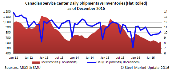 Canadian shipments for all steel products in the month of November were 398,000 net tons, an increase of 11.6 percent from the month before and an increase of 11.3 percent from November 2015. Inventories at the end of the month stood at 1,087,700 tons, up 0.7 percent from last month but down 5.7 percent from the same month one year ago.