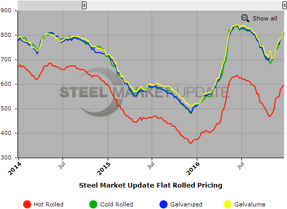 SMU Note: Below is a graphic showing our hot rolled, cold rolled, galvanized, and Galvalume price history. To use the graphs interactive capabilities, you must view it on our website here. If you need help navigating the website or need to know your login information, contact us at info@SteelMarketUpdate.com or by calling 800-432-3475.