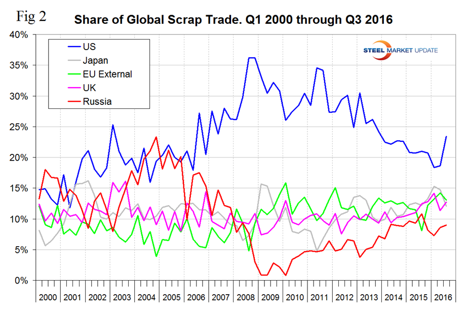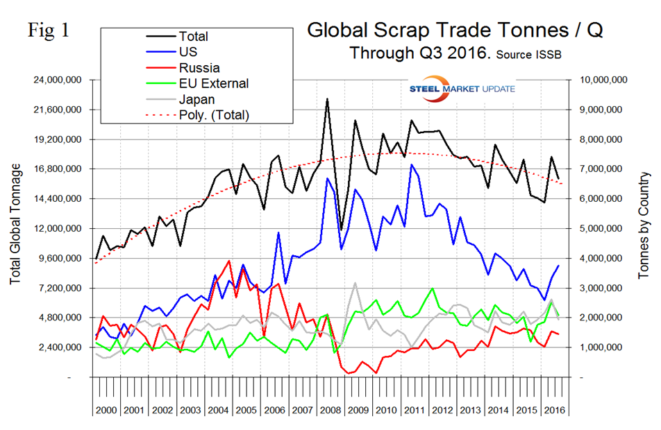 - Global scrap trade declined through the first two quarters of 2016 but increased strongly in the second quarter and held most of that gain in the third.