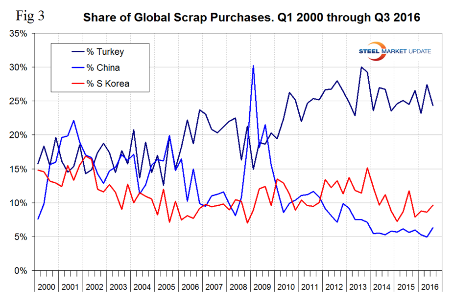 Turkey the largest global scrap buyer and has seen its share of total global purchases remain fairly constant at around 25 percent for the last 4.5 years (Figure 3).