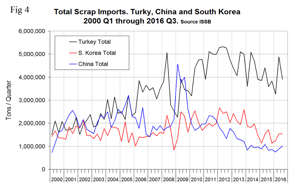We include China in this chart even though they are not much of a player on either side of the scrap trade equation. We expect that to change as the massive consumption of steel within China begins to be recycled. China’s steel production is 93 percent BOF therefore there will be a time when huge tonnages of scrap hit the global market. In the long run China will reduce its dependence on iron ore in preference for scrap but considering their already huge surplus in capacity, new investments in EAFs can be expected to be slow. Turkey’s actual import tonnage has been on a downward trend for 3.5 years as it followed the decline in the global total, Figure 4, however there was a strong bounce back in the third quarter.