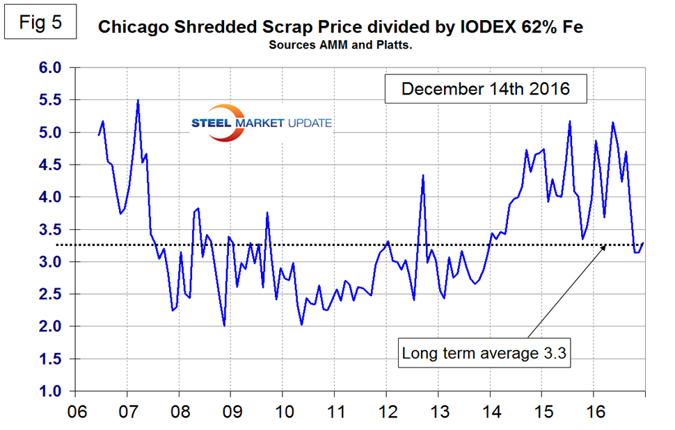 - In the two years from mid-2014 through mid-2016, the price ratio of iron ore to scrap made semi-finished out of China attractive compared to scrap. This is no longer the case.
