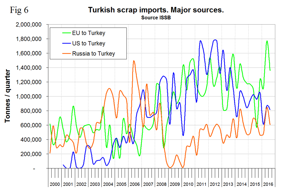 This has been another contributor to the recent strengthening of domestic scrap prices in the US. In the period 2010 through 2013 Turkey purchased a similar tonnage from the US as it did from the EU but as the Euro has declined in US dollar terms their scrap has become more attractive and in Q2 of this year European shipments to Turkey surged to over double the US tonnage. There was a correction in the third quarter (Figure 6).