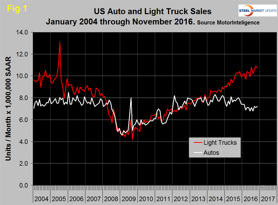 US Vehicle Sales and NAFTA Vehicle Production through November 2016