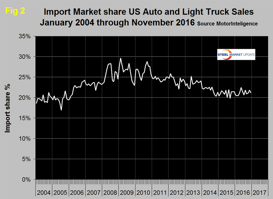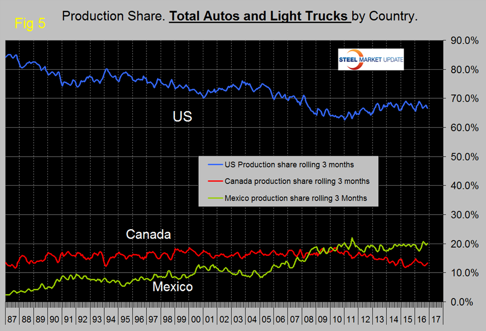 In November on a rolling three month basis, the US production share of total light vehicles was 66.6 percent which was slightly lower than the 67.3 percent for the year. Canada’s was 13.3 percent which was almost the same as the 13.3 percent monthly average for the year. Mexico’s was 19.2 percent which was one percent better than the average for the year. Production in Mexico in 2014 was 3.2 million units, in 2015 was 3.4 million units and through November 2016 annualized was 3.498 million units. The Mexican production target for 2020 in 5.0 million units according to Eduardo Solis, president of the Mexican Automotive Industry Association.