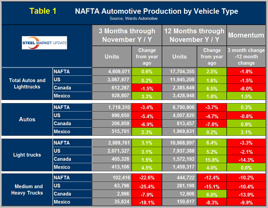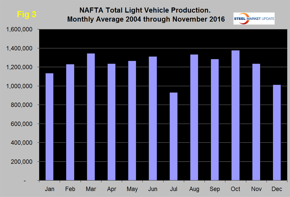 Total light vehicle (LV) production in NAFTA in November was at an annual rate, of 17.921 million units, down from 18.995 million in October. In cases where seasonality is more than a weather effect we like to compare the monthly result with the monthly norm over a number of years. On average since 2004, November’s production has been 10.3 percent lower than October. This year production declined by 5.7 percent therefore we see November’s report as positive in the long term context (Figure 3).