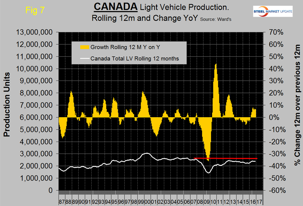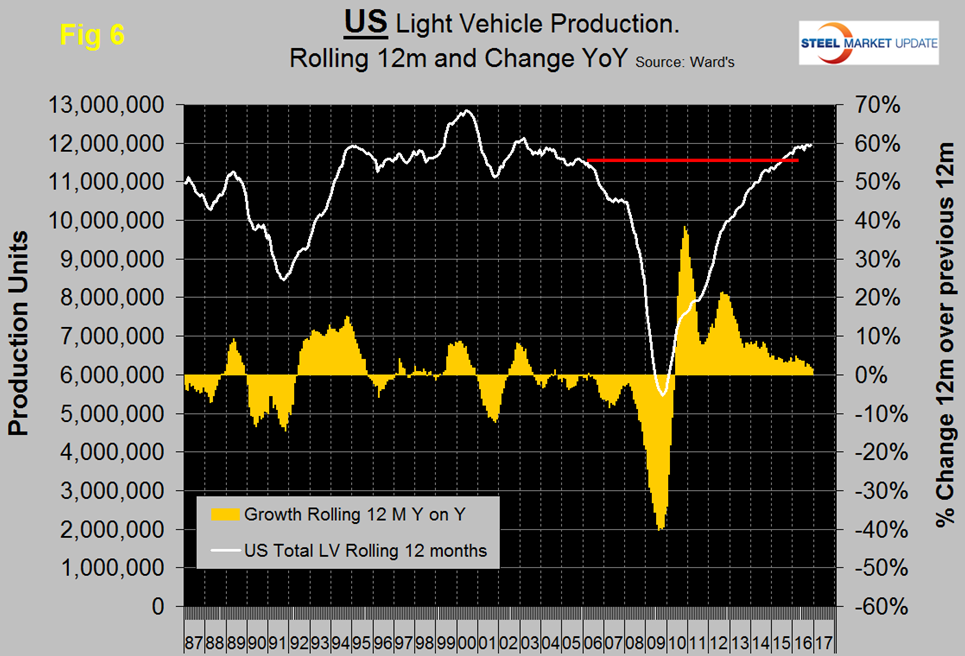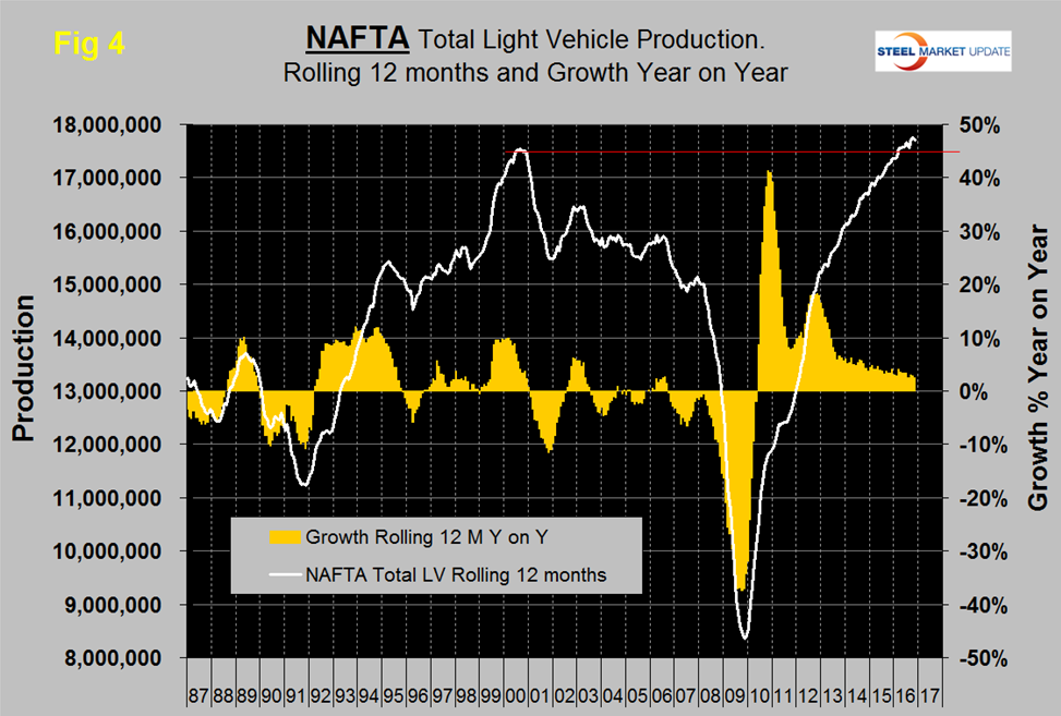 On a rolling 12 months basis y/y through November, LV production in NAFTA increased by 2.5 percent which was down from 2.9 percent in 12 months through October. There has been a very gradual slowdown in growth for the last three years as indicated by the brown bars in Figure 4, however production has been at an all-time high every month in 2016.