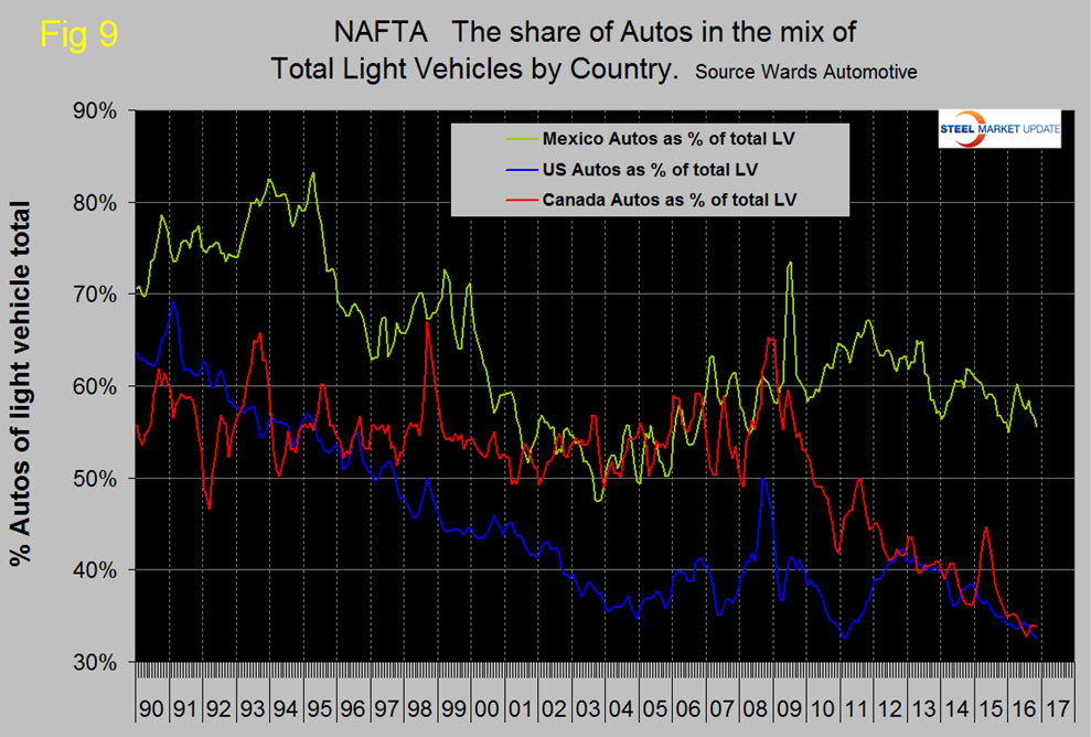 Figure 9 shows that the percentage of autos in the light vehicle production of each country has been declining in all three cases since 2012, driven by consumer buying preferences which in turn are heavily influenced by gas prices.