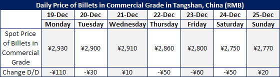 But we noticed that the prices of 3nd ten days of Dec from Shagang/Hebei Group was not so big, and spot price of Billets went up by RMB20/MT on Sunday. Some traders said heavy drop within short period is in order to next increase as they thought winter plan of steel purchase is coming. As far as we know some traders already canceled their purchase plan because of high market level.