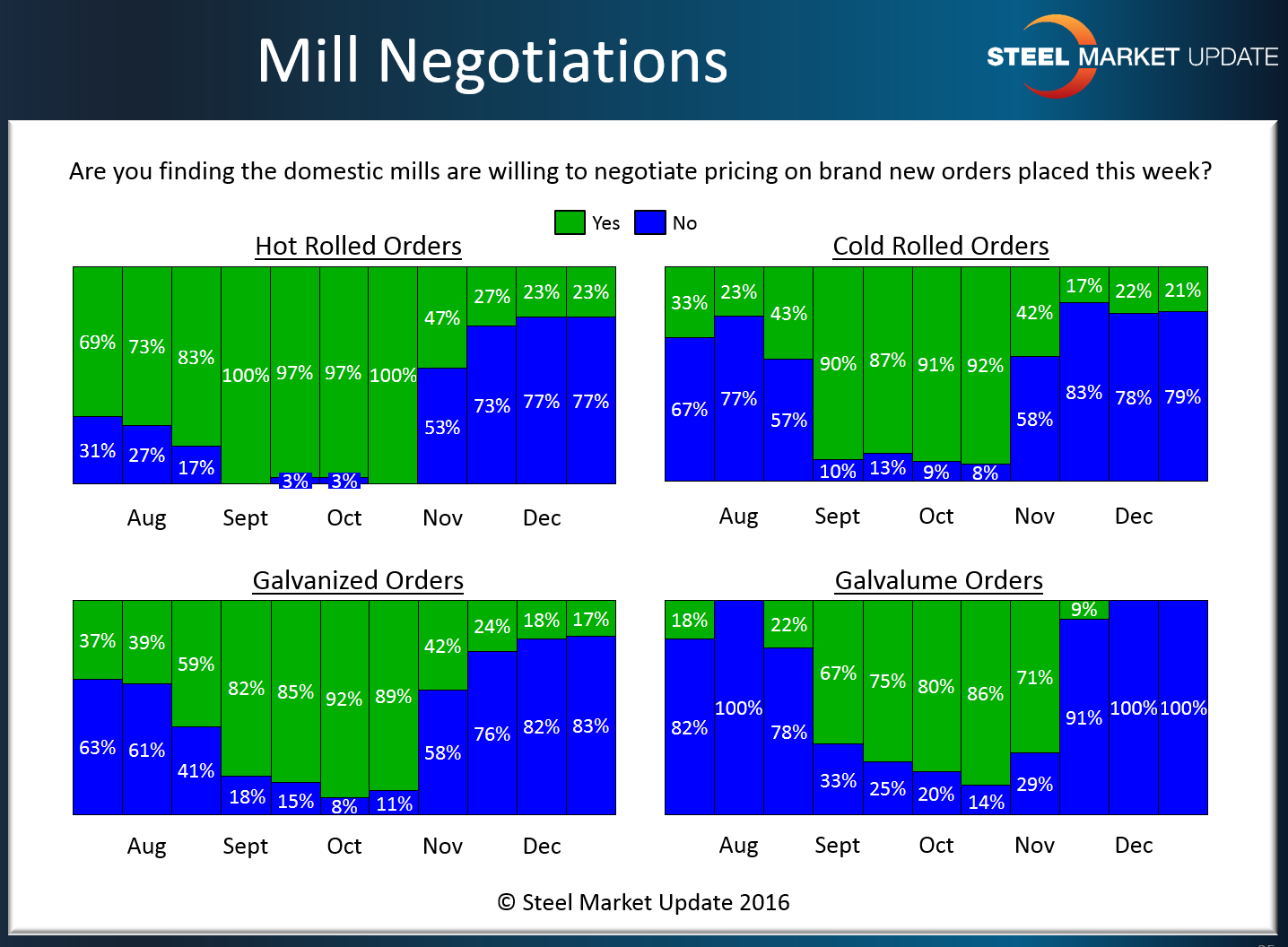 Our respondents remained firmly entrenched regarding hot rolled price negotiations with only 23 percent of our respondents reported the mills as willing to negotiate. This is unchanged from the beginning of the month and a long way away from the 47 percent reporting the mills as willing to negotiate HRC spot prices back in early November.