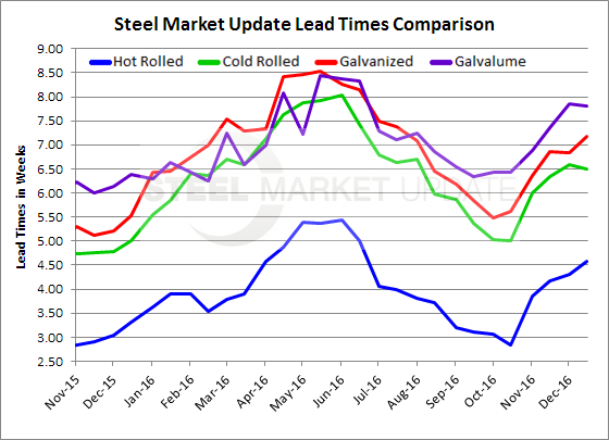 Based on the results of the Steel Market Update flat rolled steel market trends analysis performed prior to the Holiday weekend steel mill lead times continue to be extended. The respondents to our survey reported on the amount of time it takes to get hot rolled, cold rolled, galvanized and Galvalume produced from the time a new order is placed. SMU then takes the data and compiles an “average” lead time on each product. Our lead time averages are not to be construed as the actual lead time a specific mill may be quoting to their customers.