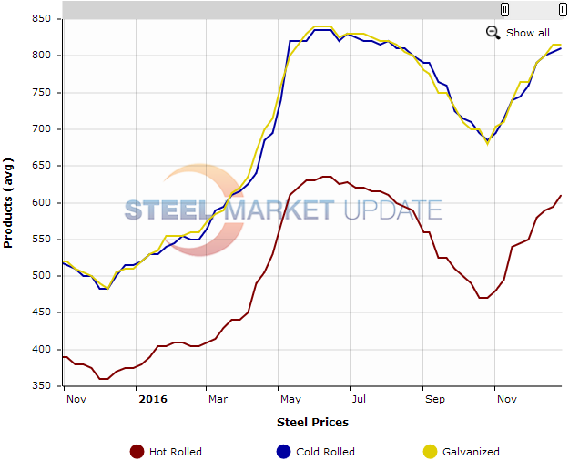 As 2016 is coming to a close we are seeing prices as having rebounded to their May 10th price levels with hot rolled at $610 per ton ($30.50/cwt), cold rolled $810 per ton ($40.50/cwt) and galvanized at $815 per ton ($40.75/cwt) base price averages.