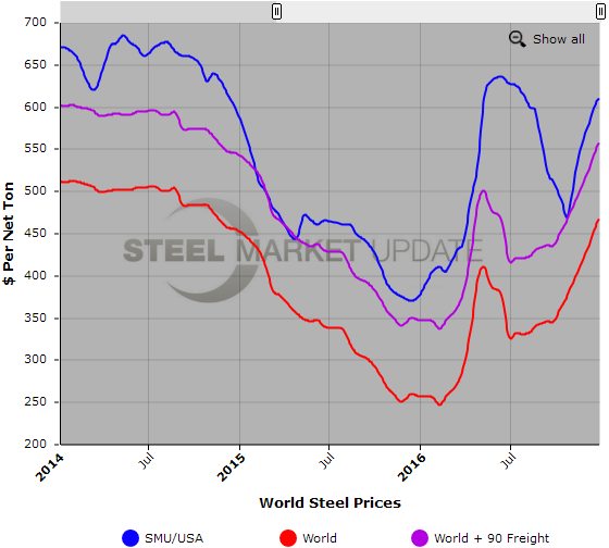 The SteelBenchmarker world export price for hot rolled bands is $467 per net ton ($515 per metric ton) FOB the port of export according to data released by SteelBenchmarker on Monday December 26th. This is up $22 per ton from the previous release on December 12th. Adding in $90 in estimated import costs, that puts prices around $557 per ton delivered to the US.