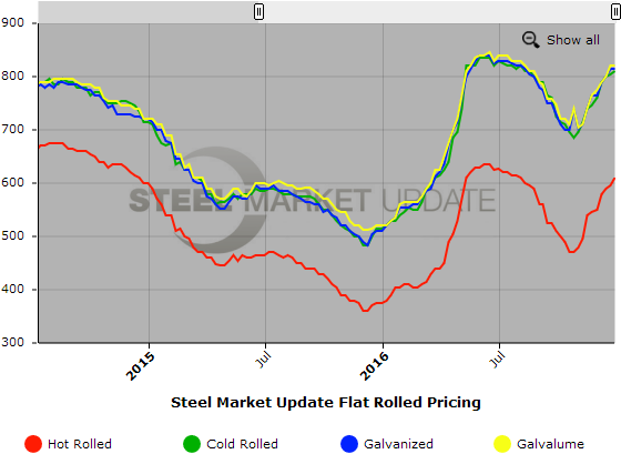 SMU Note: Below is a graphic showing our hot rolled, cold rolled, galvanized, and Galvalume price history. To use the graphs interactive capabilities, you must view it on our website here. If you need help navigating the website or need to know your login information, contact us at info@SteelMarketUpdate.com or by calling 800-432-3475.