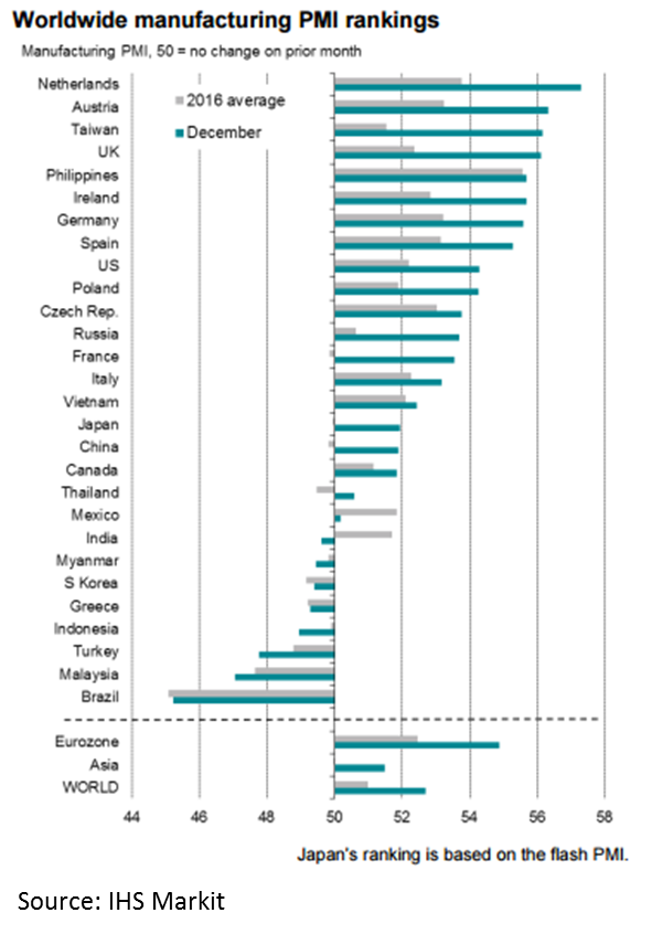 After a flat first half, the second half of 2016 showed steady growth in the manufacturing sector. The December survey by IHS Markit indicates global manufacturing is growing at a rate of 4 to 5 percent.