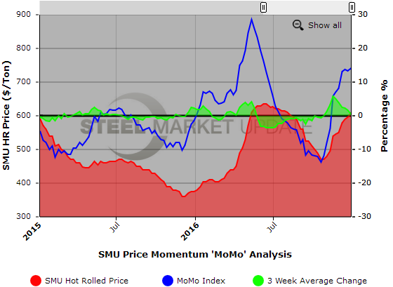 MoMo was measured at 12.01 percent this week, meaning that the current HRC price is higher than the average price over the last 12 weeks.