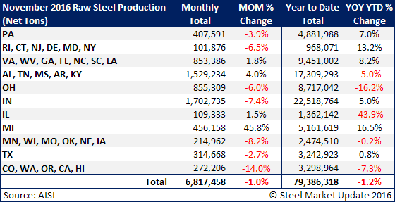 The American Iron & Steel Institute (AISI) recently reported final U.S. raw steel production estimates for the month of November 2016. The monthly estimates are different than the weekly estimates we report in our Tuesday issues; the AISI bases the monthly estimates on over 75 percent of the domestic mills reporting vs. only 50 percent for the weekly estimates.