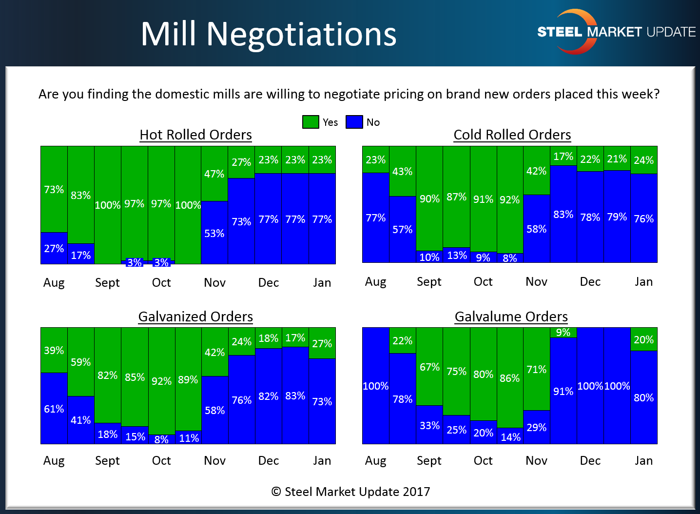 Steel mills continue to feel comfortable when negotiating with their customers. We found that only one quarter of the steel buyers responding to our survey for this week reported the mills as willing to discuss the possibility of adjusting (lowering) steel spot prices. We found this to be consistent across all flat rolled products: hot rolled, cold rolled, galvanized and Galvalume steels.
