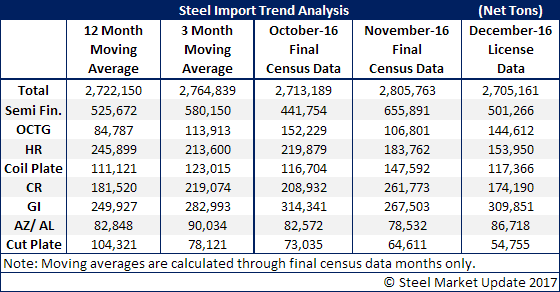 In December’s totals the item that sticks out like a sore thumb is galvanized at 309,000 tons. This is well above the twelve month moving average and also higher than the three month moving average. On the flip side, hot rolled is well below both the 12MMA and 3MMA as is cut to length plate.