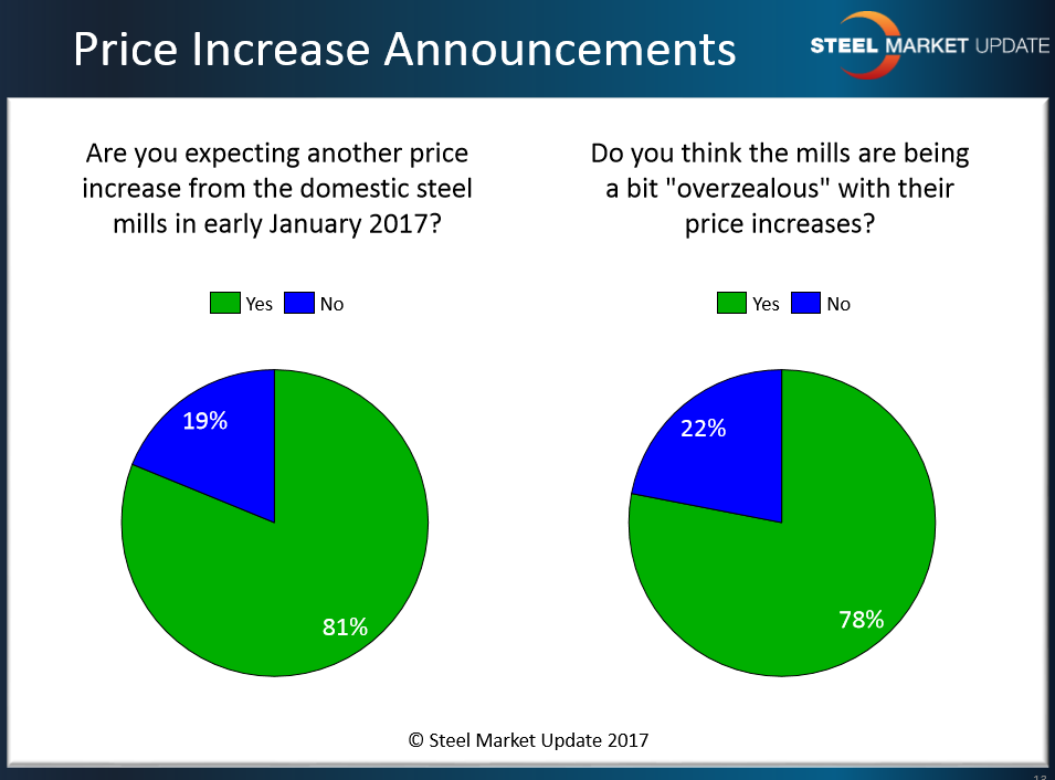Eighty-one percent of the respondents reported that they were expecting another flat rolled steel price increase (the 5th in the current market cycle) early in January 2017. At the same time, 78 percent of those responding felt the domestic steel mills were being a bit “overzealous” with the pace of the increase announcements.