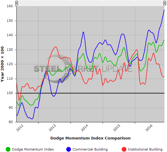 Below is a graph showing the history of the Dodge Momentum Index. You will need to view the graph on our website to use its interactive features, you can do so by clicking here. If you need assistance logging into or navigating the website, please contact our office at 800-432-3475 or info@SteelMarketUpdate.com.